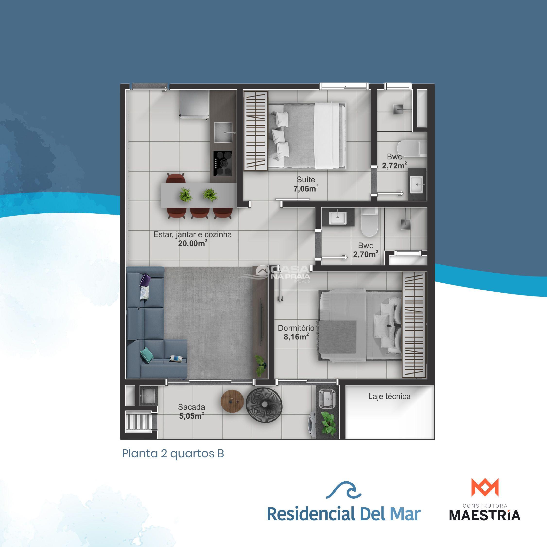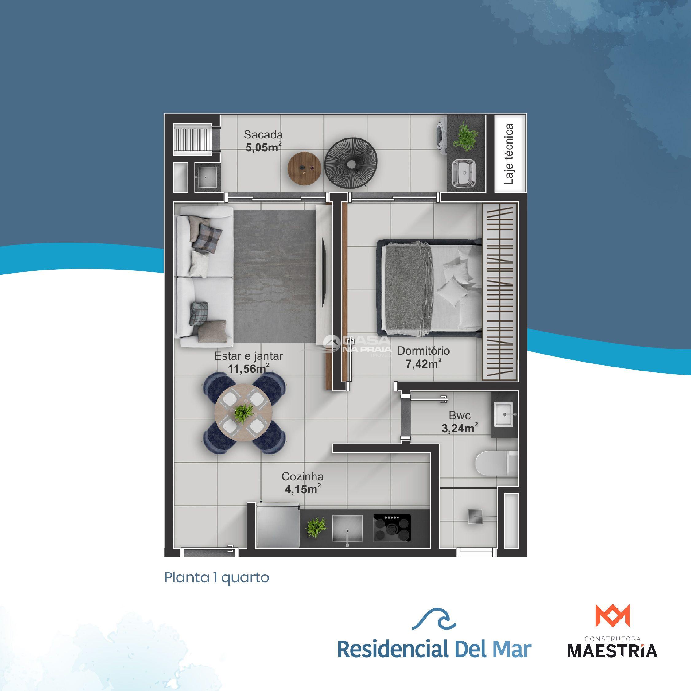 Apartamento 01 suíte, sala com 02 ambiente, banheiro social, área de serviço, sacada com churrasqueira, 01 vaga de garagem.