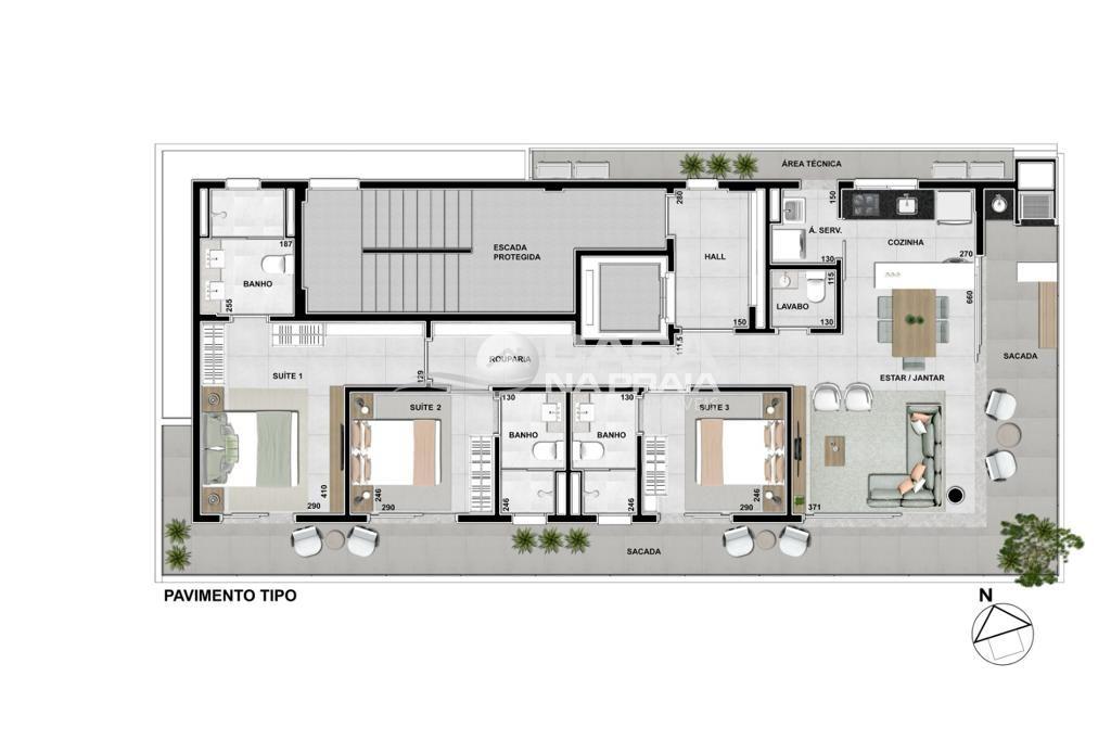 Apartamento: 03 dormitórios (sendo 03 suítes)com sacada, sala de estar e cozinha integrada, Living estendido a sacada, lavabo, espaço gourmet com churrasqueira, área de serviço, 02 vagas de garagem.
